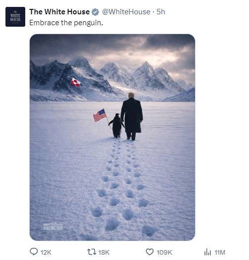 当地时间1月23日,美国白宫在社交媒体发布了一张AI图片。图片中美国总统特朗普和手持美国国旗的企鹅行走在冰天雪地中,他们的前方插着丹麦自治领地格陵兰岛旗众豪配资,并配文“拥抱企鹅”。