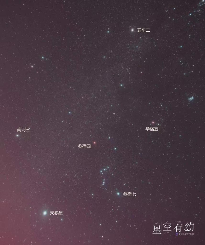 “冬季大钻石”成员所属的星座几乎将冬季星空的明星星座全部囊括。其中,参宿七所在的猎户座是冬季星空的绝对主角。王科超介绍,猎户座“腰带”下方,肉眼可见一团模糊的光影是猎户座大星云,由星际尘埃和气体构成,是孕育新恒星的地方。