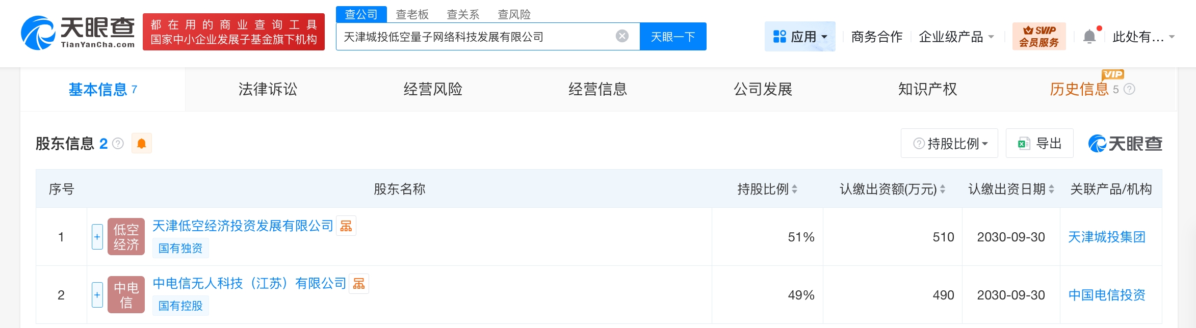 天眼查工商信息显示弘盛配资,近日,天津城投低空量子网络科技发展有限公司成立,法定代表人为王宝魁,注册资本1000万人民币,经营范围含智能无人飞行器销售、5G通信技术服务、数据处理和存储支持服务、互联网数据服务、通信设备销售、人工智能行业应用系统集成服务、信息系统集成服务、网络与信息安全软件开发等。股东信息显示,该公司由天津低空经济投资发展有限公司、中电信无人科技(江苏)有限公司分别持股51%、49%。